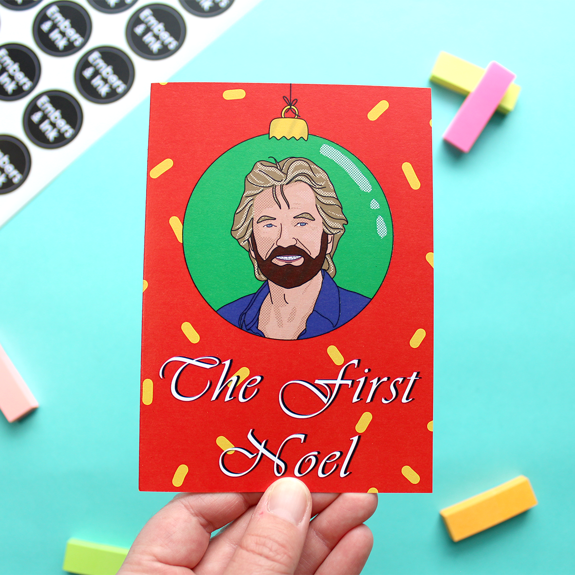 The card reads 'The First Noel' underneath an illustration of Noel Edmonds within a Christmas bauble.