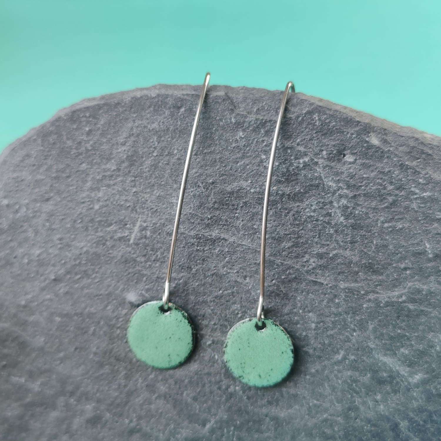 - Light sage green long drop earrings, black on reverse