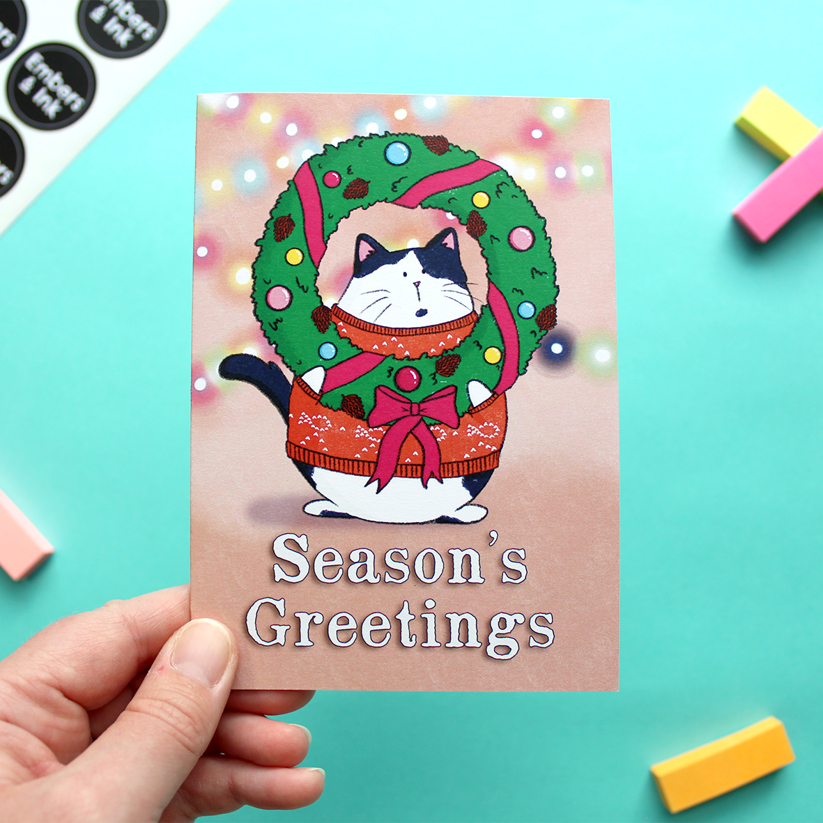 Here's a Christmas card for the cat lovers, featuring a cat who is wearing a Christmas jumper and holding a Christmas Wreath.